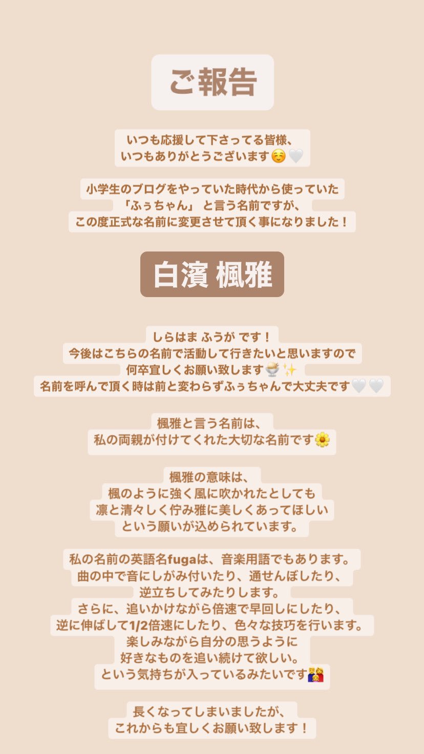 白濱 楓雅 ふぅちゃん ご報告です 拡散してください 長文なっちゃいましたが良かったら読んでください これからも呼ぶ時は ふぅちゃん って気軽に呼んでくださーい あと七夕に車の免許取れました 証明写真何回も載せてるけど 免許証